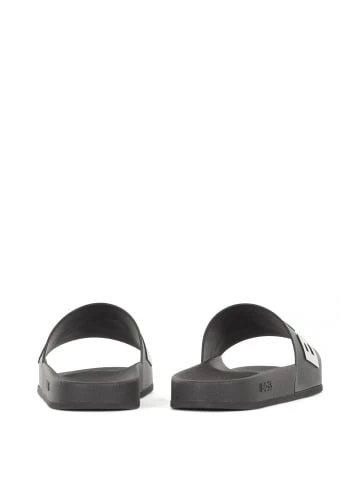 Schlichte Badesandalen von der Marke BOSS.BOSS Schriftzug auf dem Riemen.Anatomisch geformtes Fußbett. – BOSS Herren Badeschuhe – Kontrastfarbiges Logo – Gummisohle – Anatomisch geformtes Fußbett – Höchster Tragekomfort
